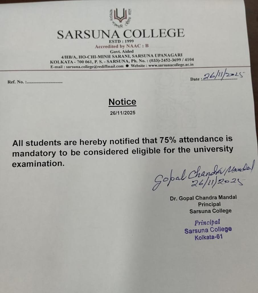 Sarsuna College has been affiliated to the University of Calcutta, Kolkata since 2000.