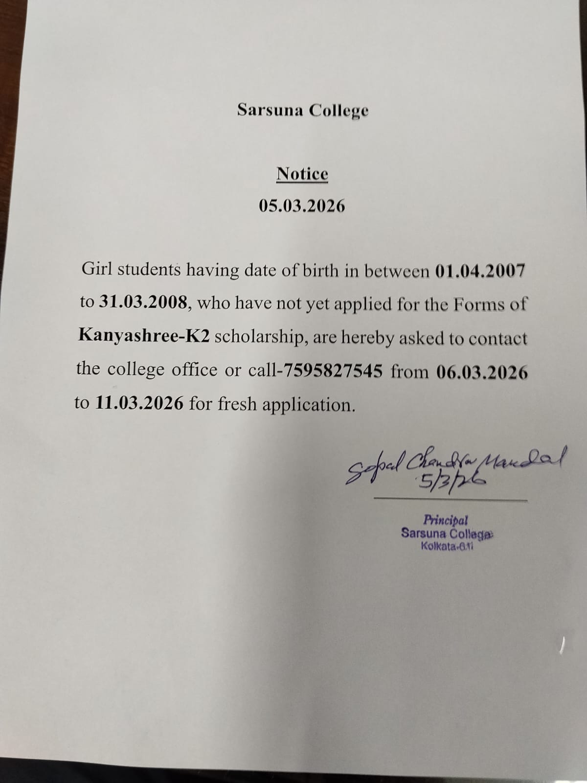 Sarsuna College has been affiliated to the University of Calcutta, Kolkata since 2000.