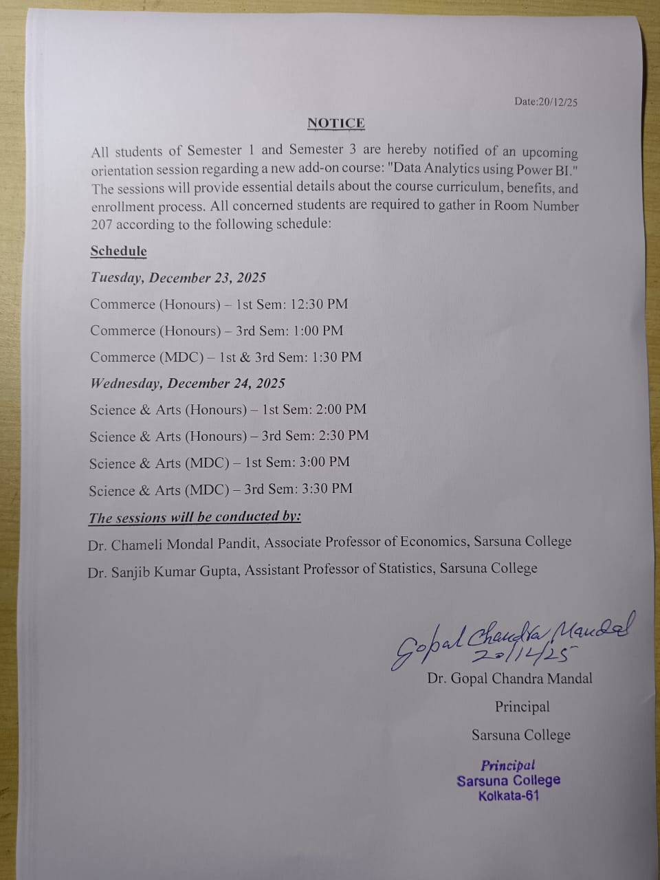 Sarsuna College has been affiliated to the University of Calcutta, Kolkata since 2000.
