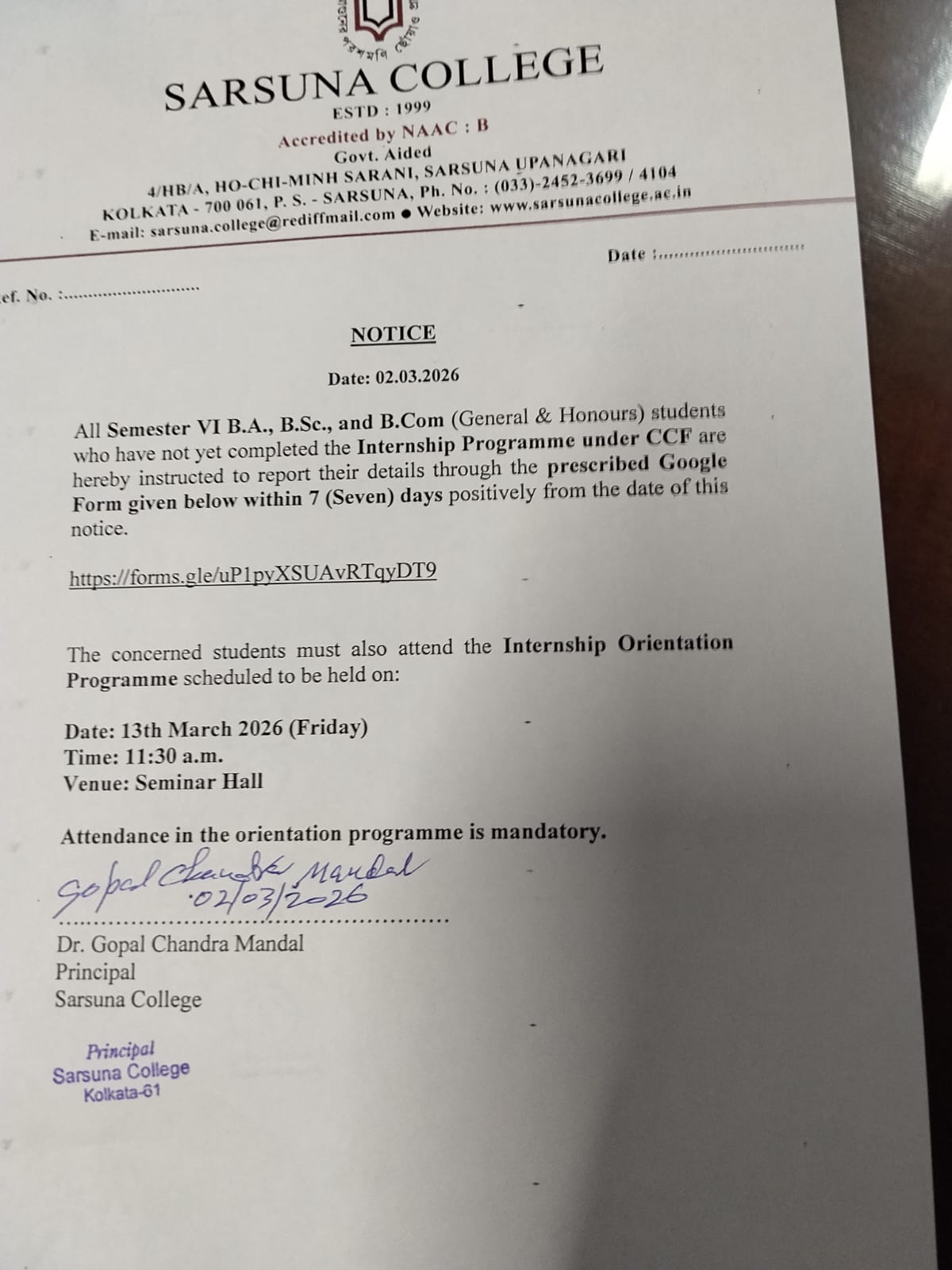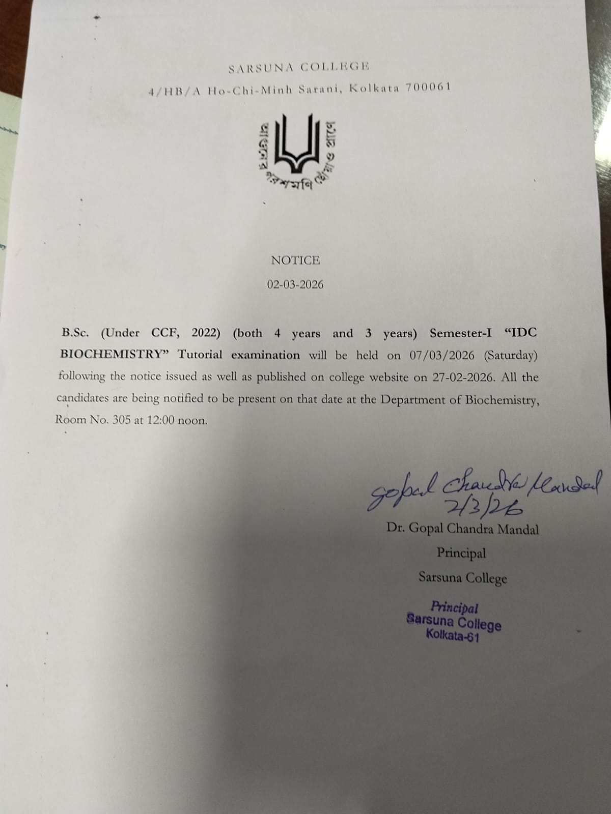 Sarsuna College has been affiliated to the University of Calcutta, Kolkata since 2000.