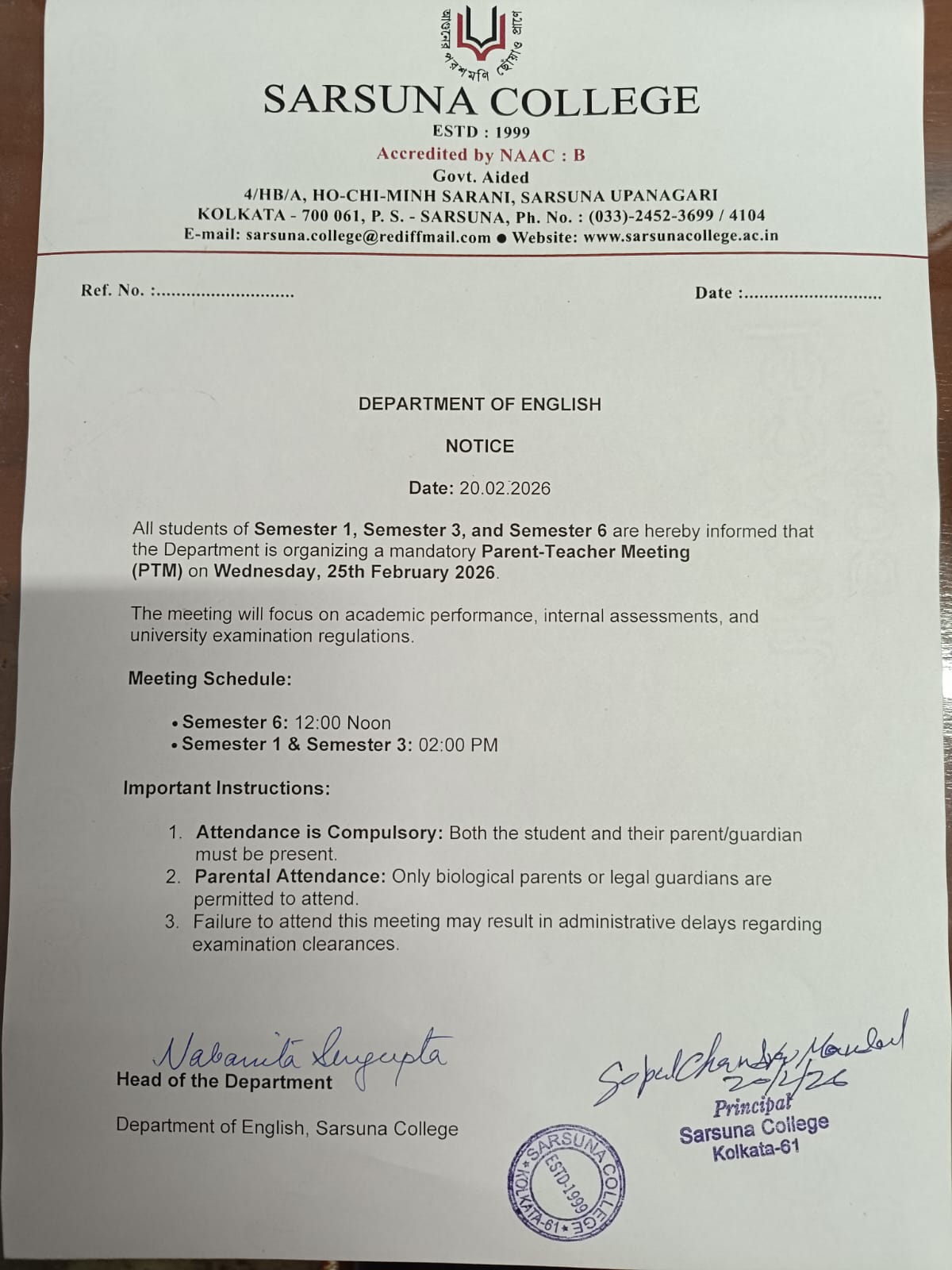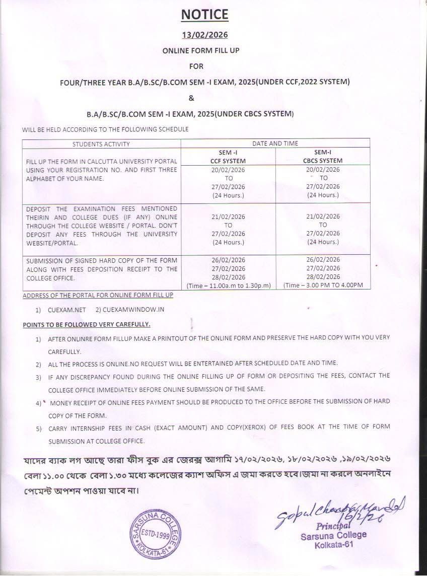 Sarsuna College has been affiliated to the University of Calcutta, Kolkata since 2000.