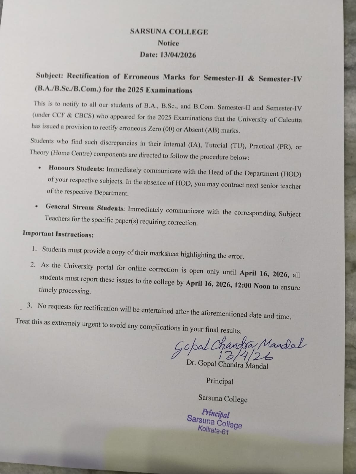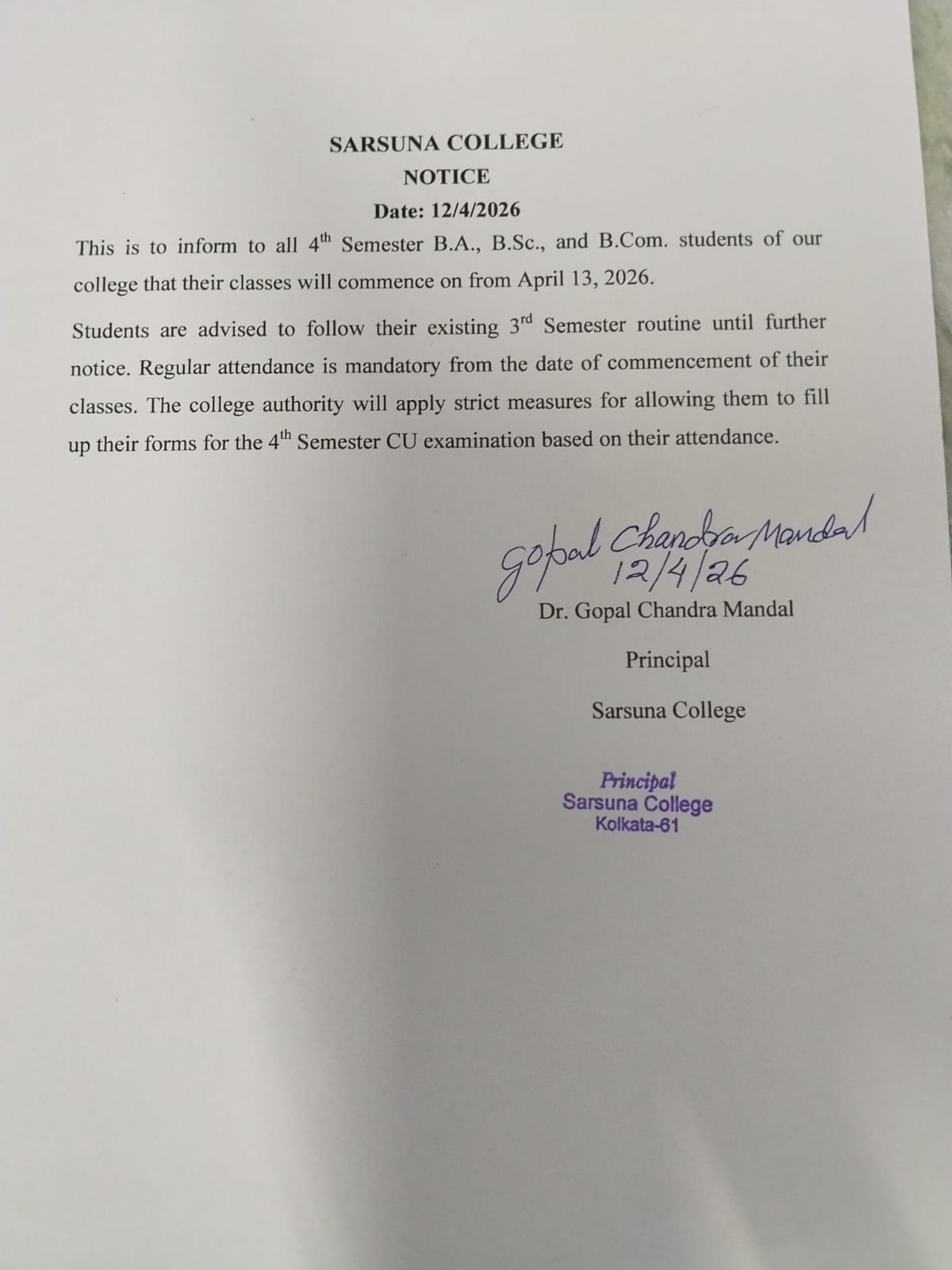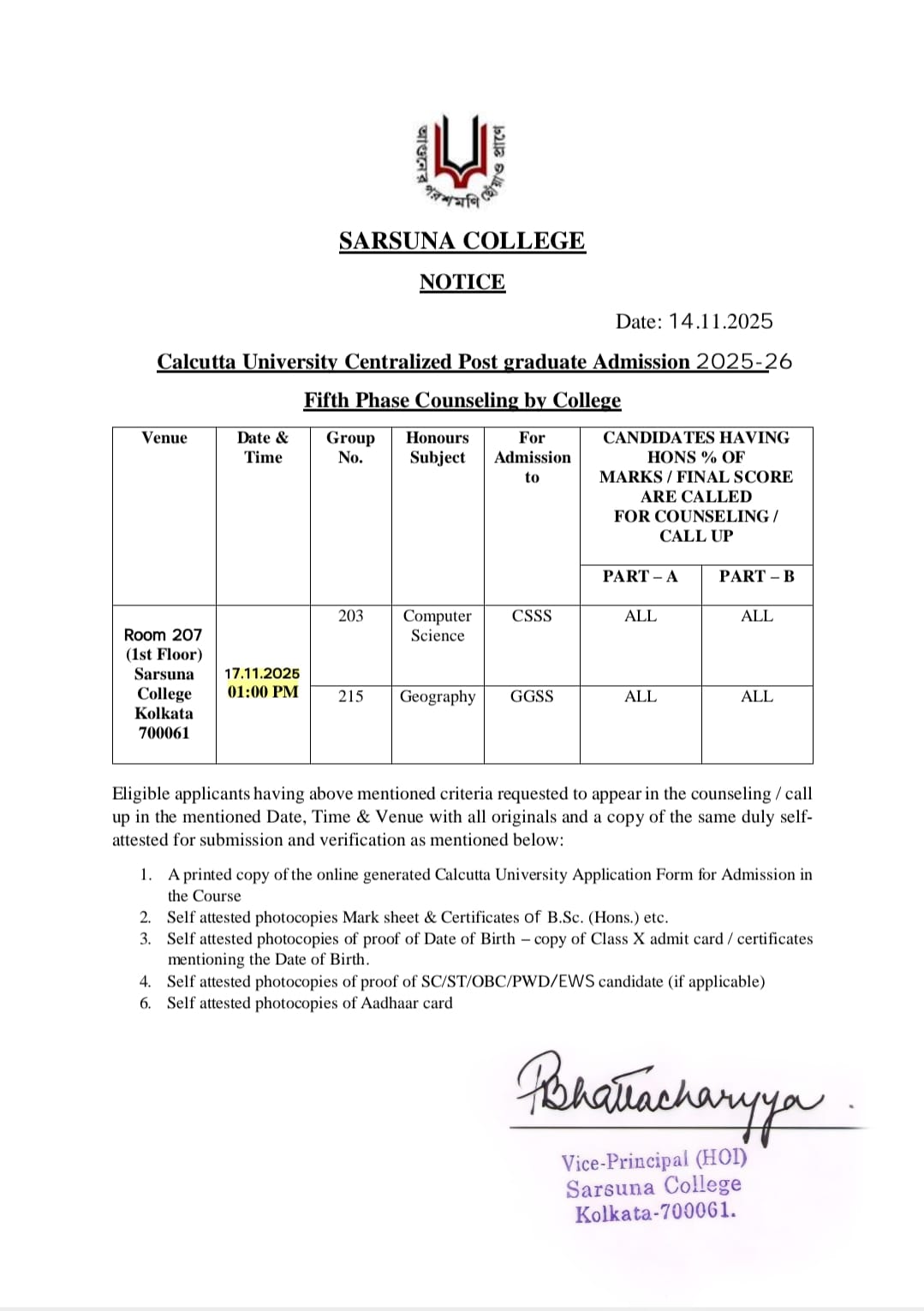 Sarsuna College has been affiliated to the University of Calcutta, Kolkata since 2000.