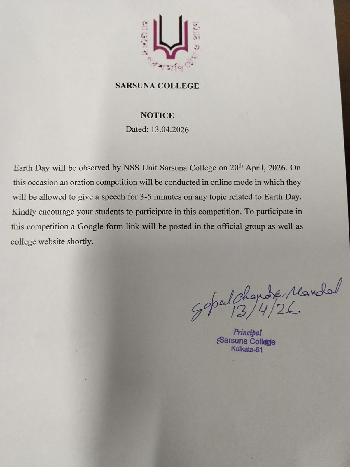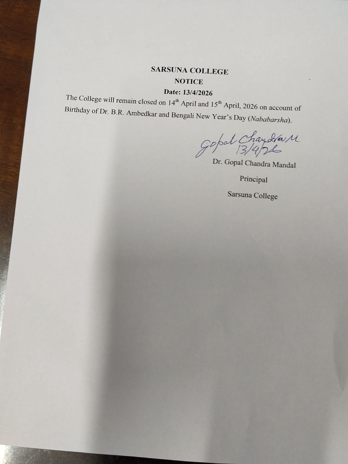 Sarsuna College, the brain child of some intellectuals who came forward to give a concrete shape to the hopes and aspirations of local common people is sprouting new branches and spreading itself to new area of higher education day by day. I am proud to be part of its glorious existence. In the constant changing of teaching- learning through its consistently good University examination results, rich infrastructure and a beautiful and congenial academic atmosphere....