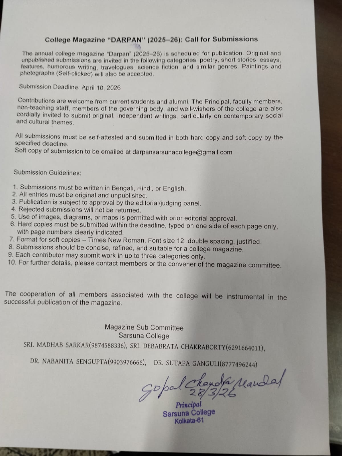 Sarsuna College, the brain child of some intellectuals who came forward to give a concrete shape to the hopes and aspirations of local common people is sprouting new branches and spreading itself to new area of higher education day by day. I am proud to be part of its glorious existence. In the constant changing of teaching- learning through its consistently good University examination results, rich infrastructure and a beautiful and congenial academic atmosphere....