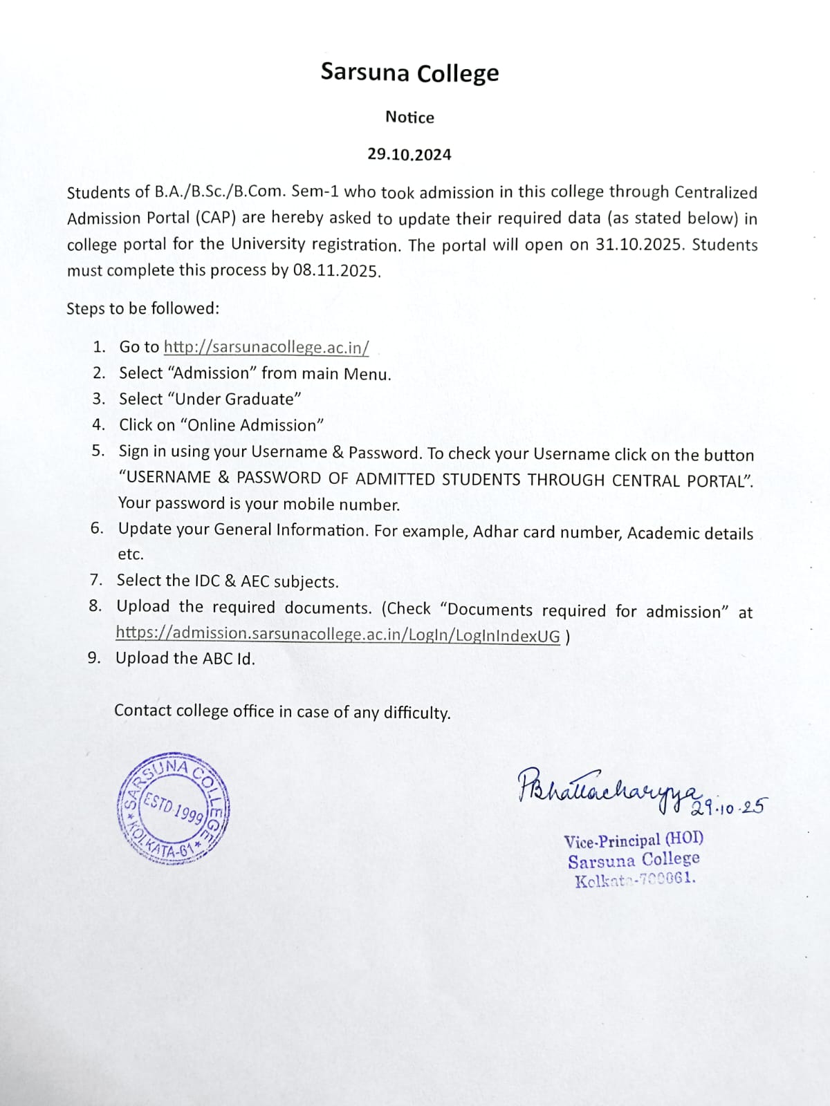 Sarsuna College has been affiliated to the University of Calcutta, Kolkata since 2000.