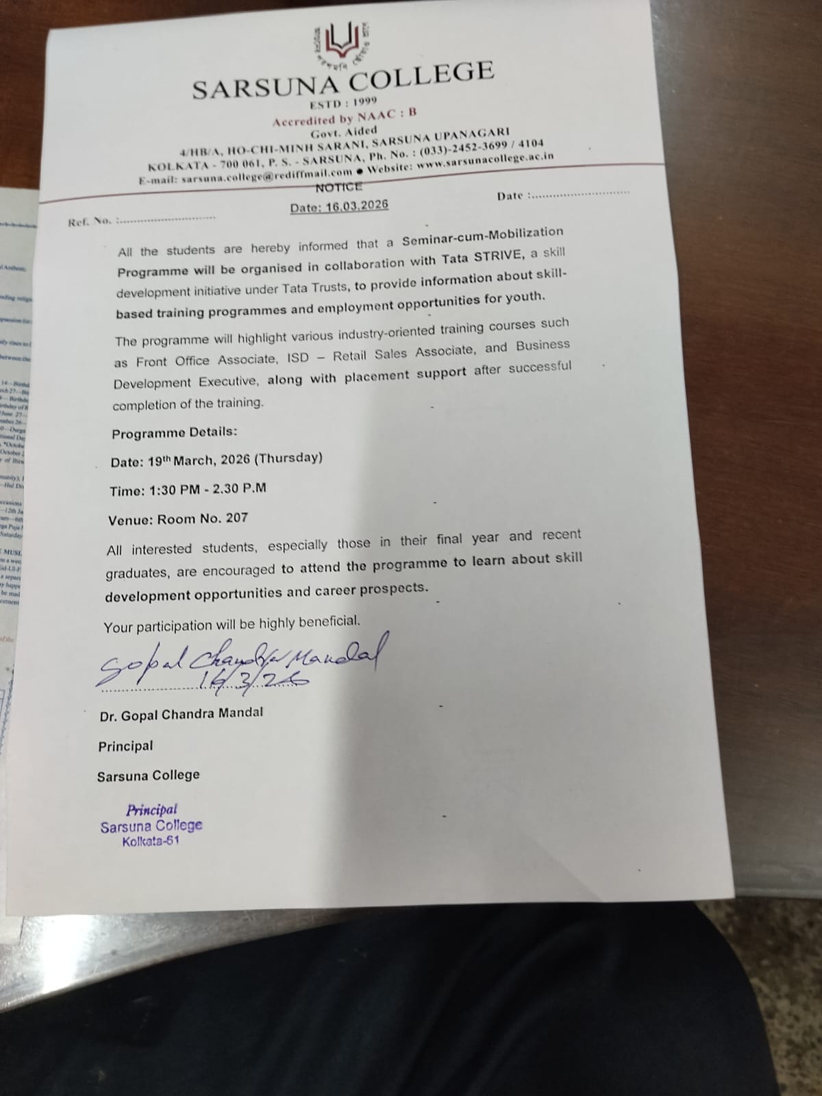 Sarsuna College, the brain child of some intellectuals who came forward to give a concrete shape to the hopes and aspirations of local common people is sprouting new branches and spreading itself to new area of higher education day by day. I am proud to be part of its glorious existence. In the constant changing of teaching- learning through its consistently good University examination results, rich infrastructure and a beautiful and congenial academic atmosphere....