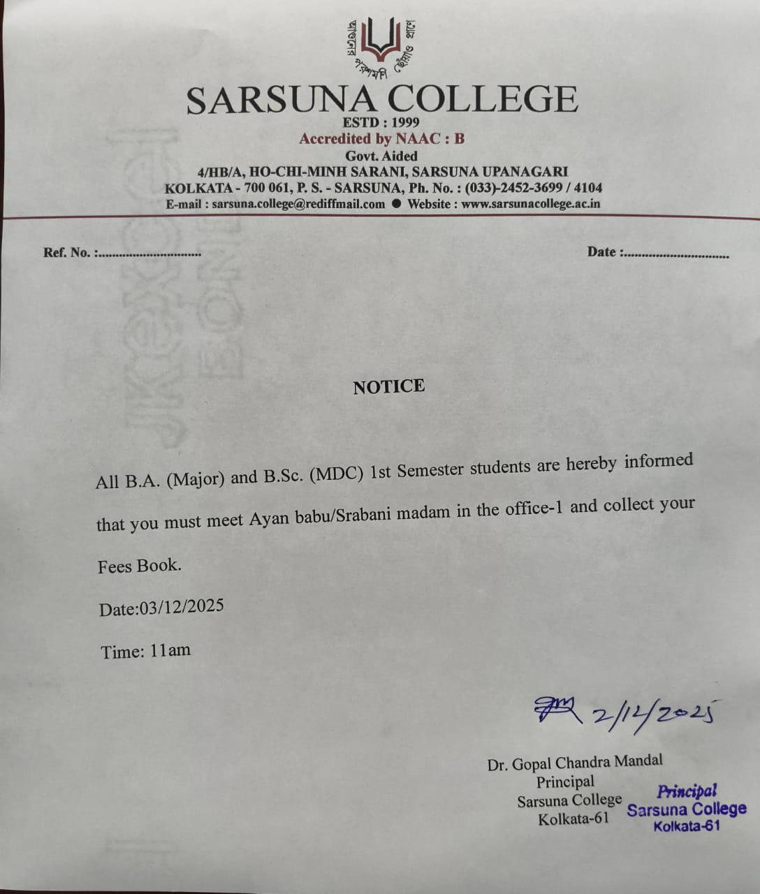 Sarsuna College has been affiliated to the University of Calcutta, Kolkata since 2000.