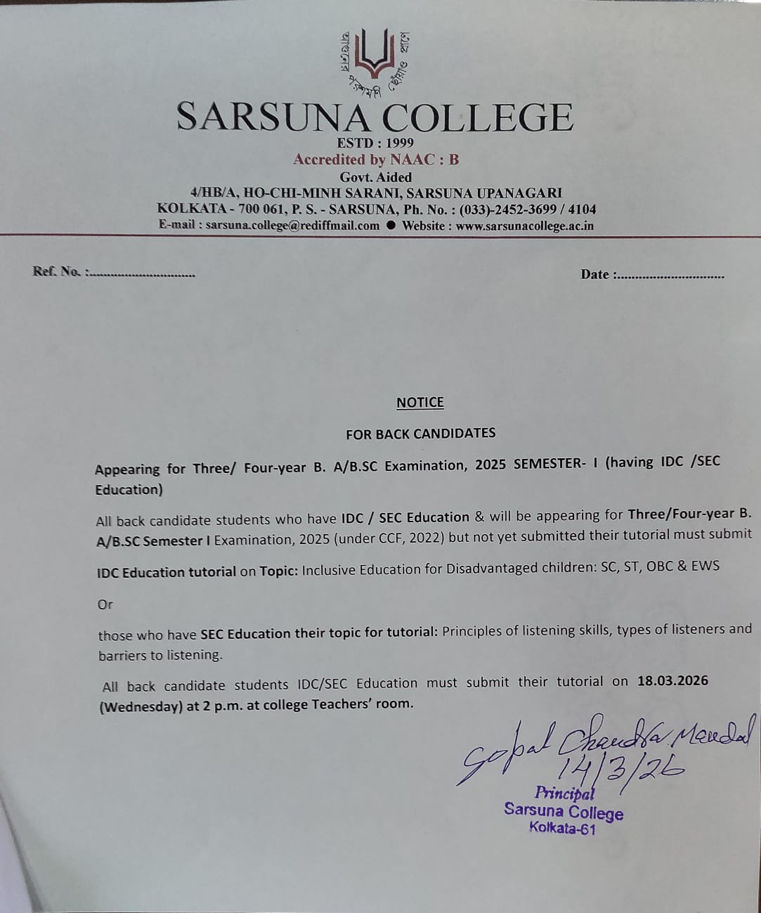 Sarsuna College, the brain child of some intellectuals who came forward to give a concrete shape to the hopes and aspirations of local common people is sprouting new branches and spreading itself to new area of higher education day by day. I am proud to be part of its glorious existence. In the constant changing of teaching- learning through its consistently good University examination results, rich infrastructure and a beautiful and congenial academic atmosphere....
