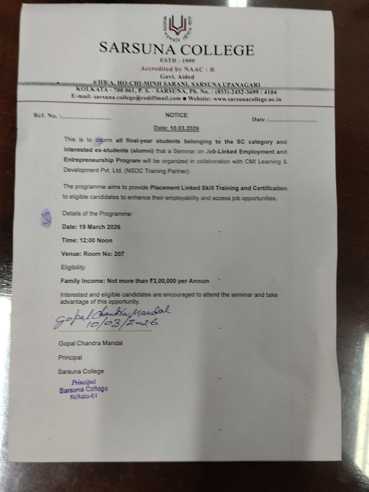 Sarsuna College has been affiliated to the University of Calcutta, Kolkata since 2000.