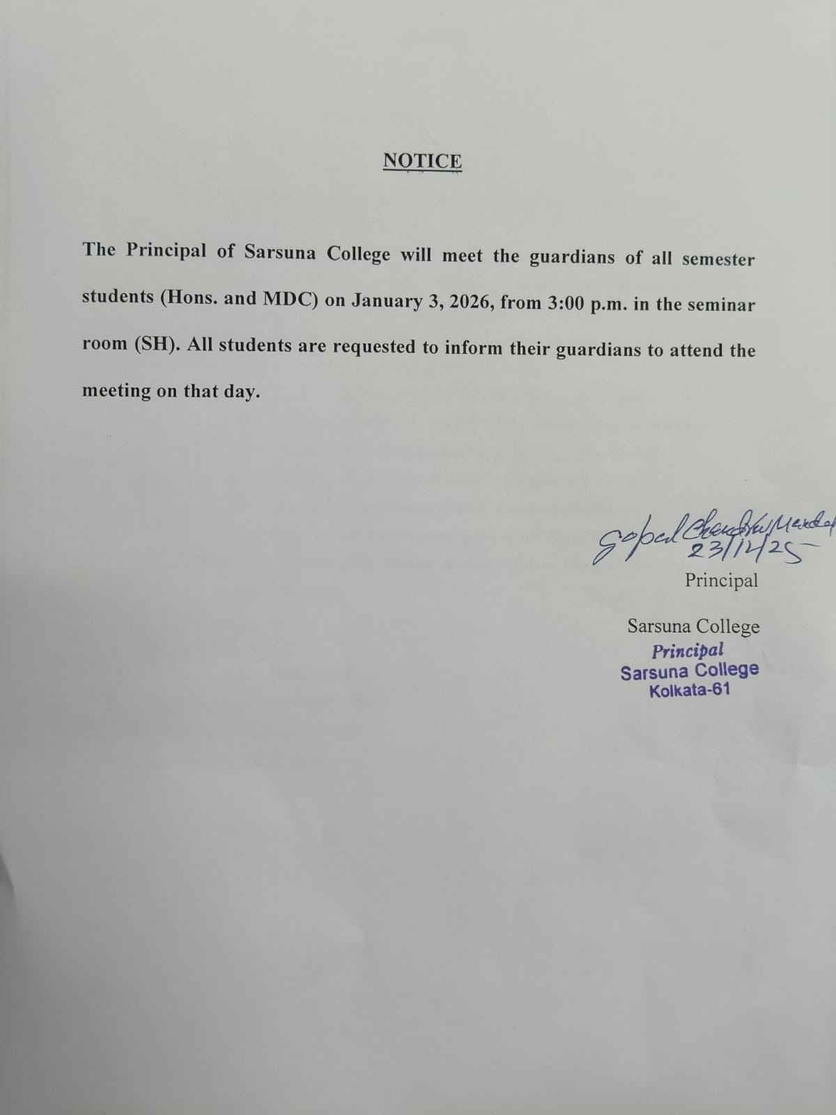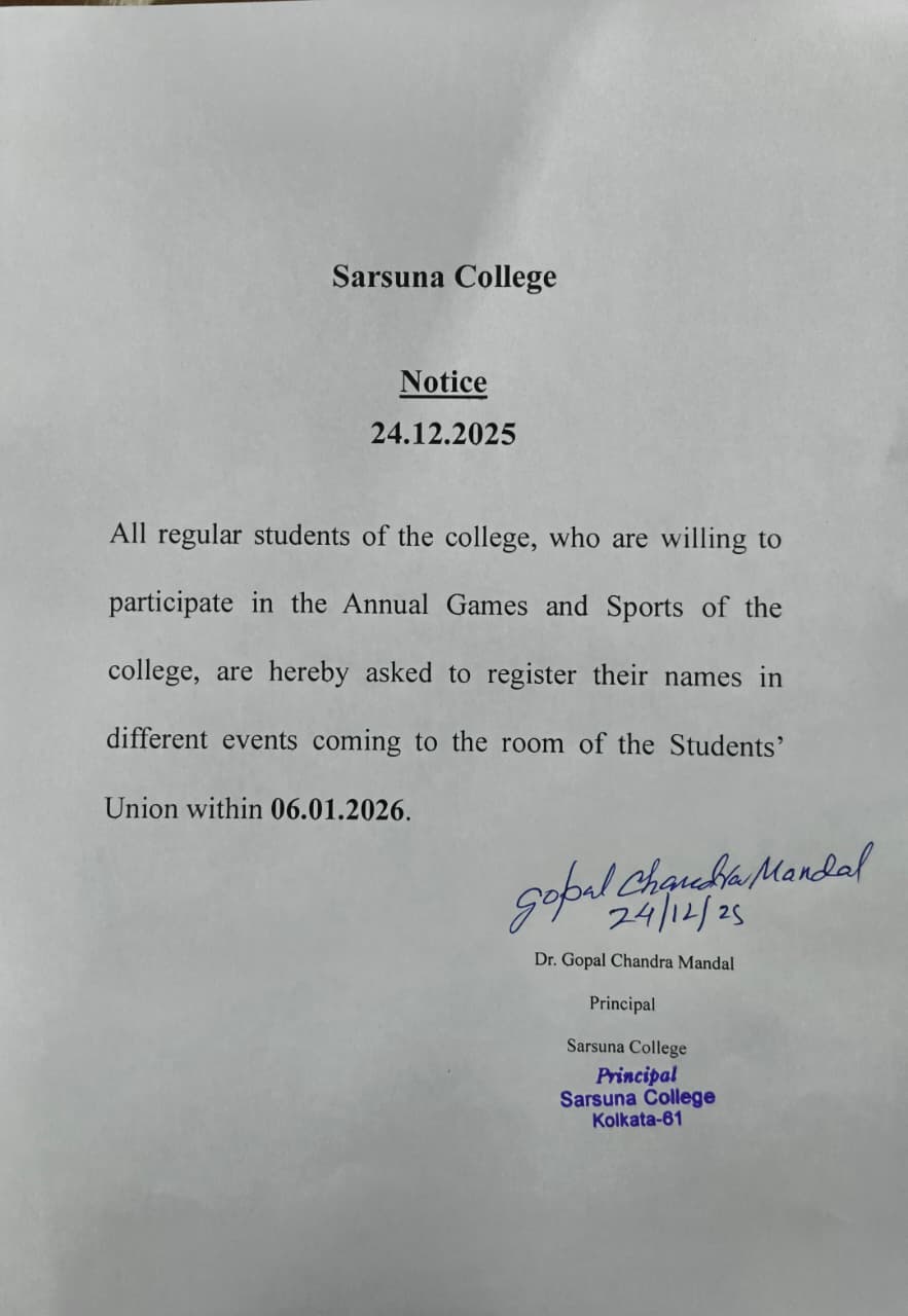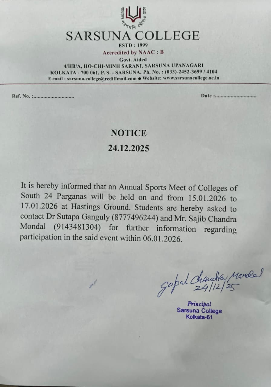 Sarsuna College has been affiliated to the University of Calcutta, Kolkata since 2000.