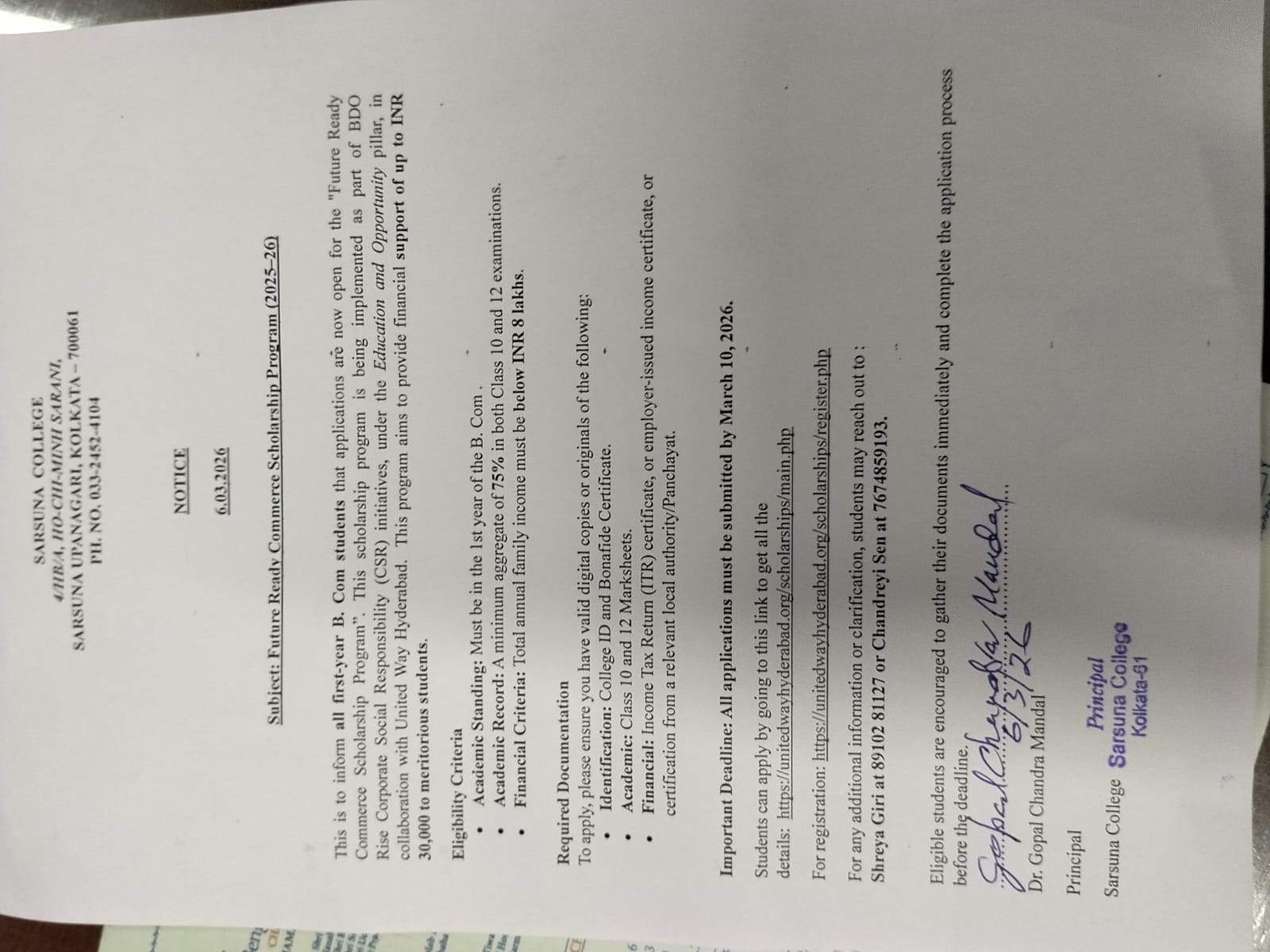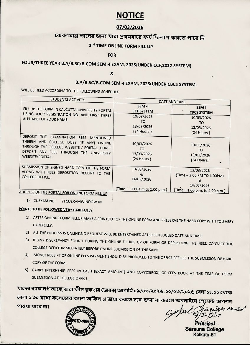 Sarsuna College has been affiliated to the University of Calcutta, Kolkata since 2000.