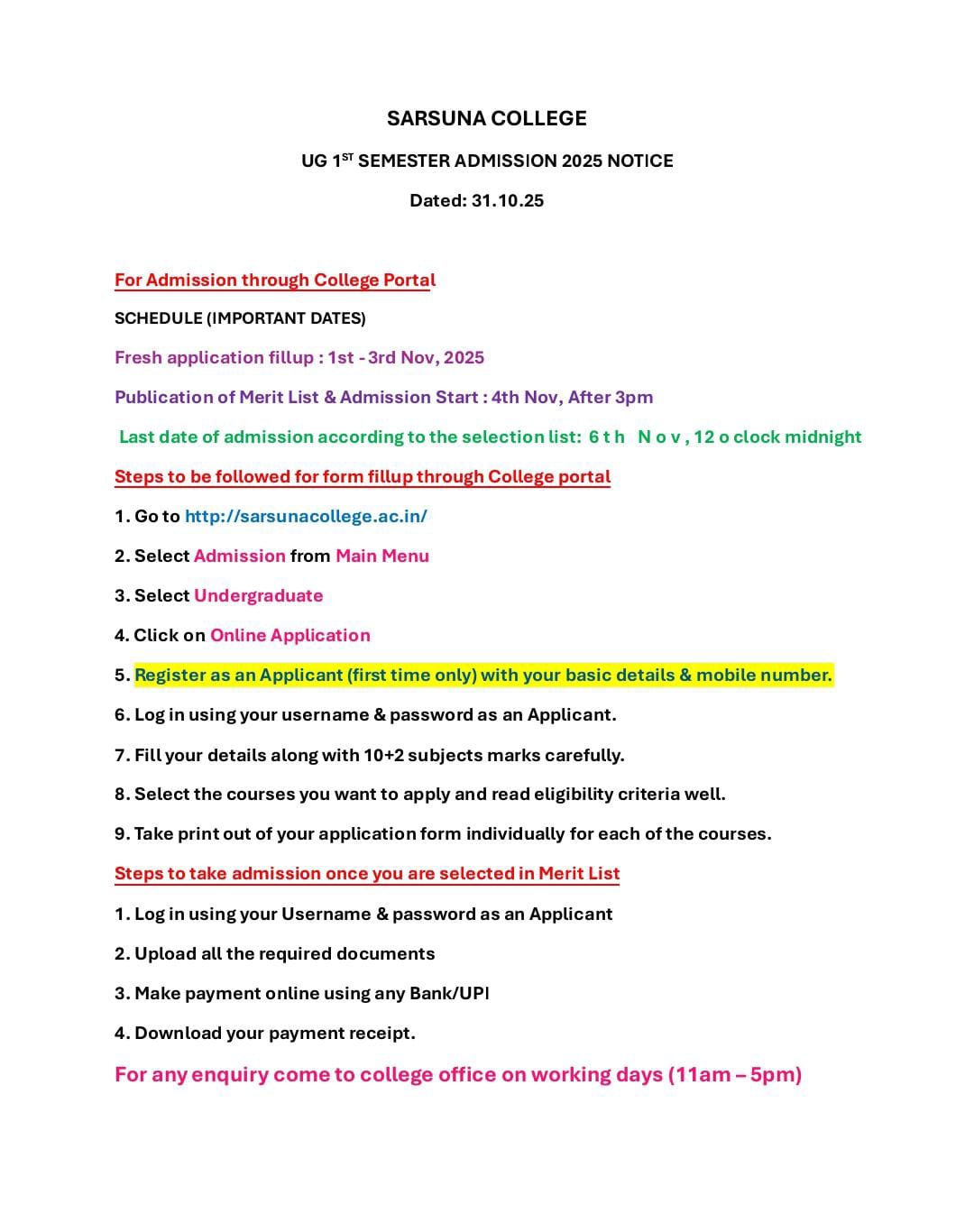 Admission Enquiry | Helpline number: +91 9432586885 (10:30 AM to 5:00 PM except Holidays) | Email: adm.sarsunacollege@gmail.com