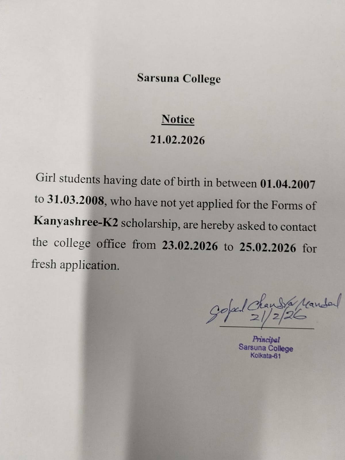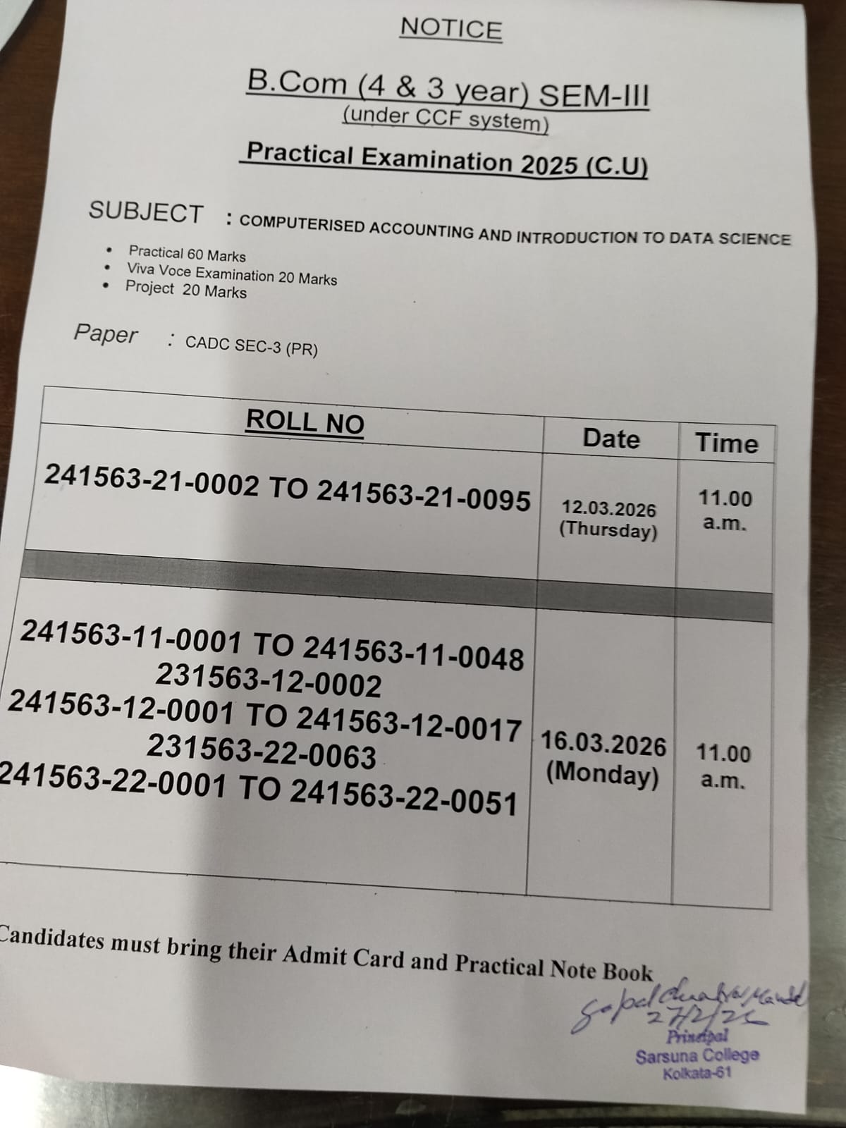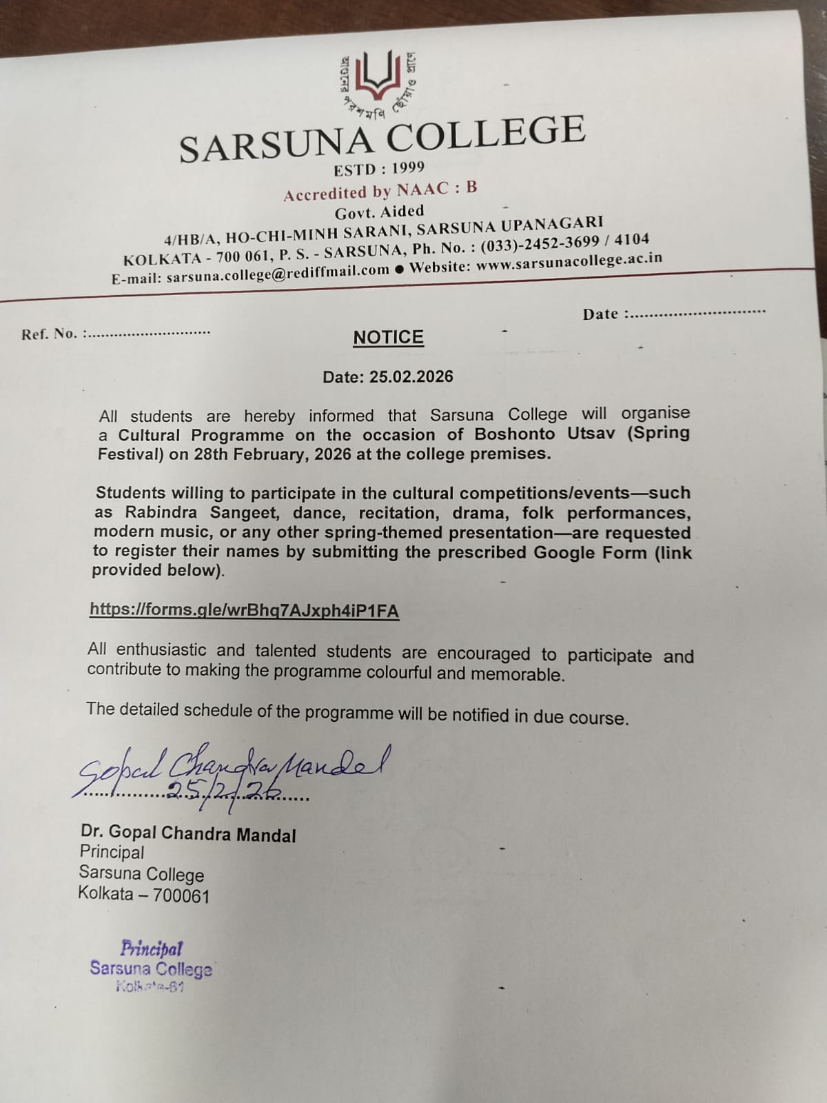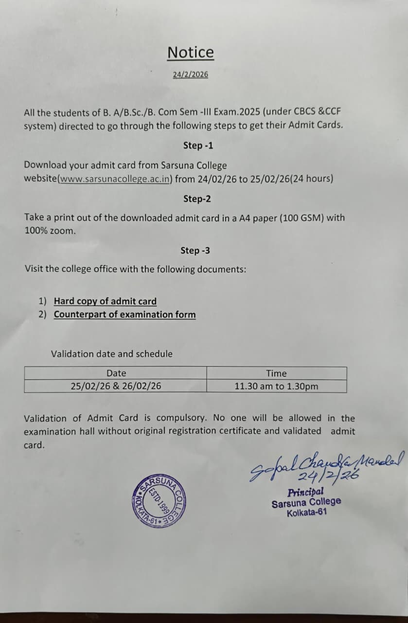 Sarsuna College has been affiliated to the University of Calcutta, Kolkata since 2000.